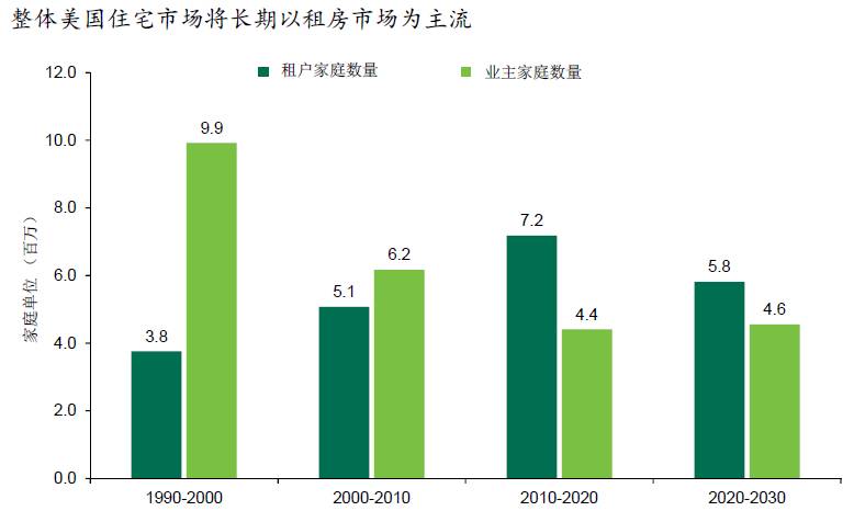2016年,租户的家庭数量明显超过业主家庭数量。看一下比较,深绿和浅绿,很明显从2010年以后,发生明显的逆转。租的家庭明显高于买的家庭,而且这个还会再持续。