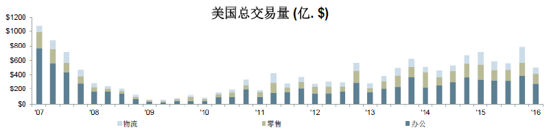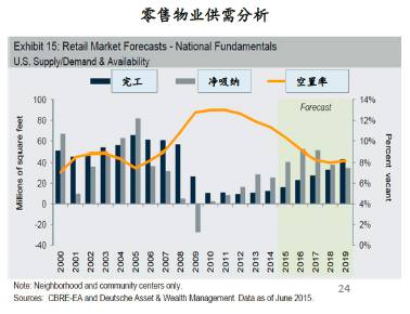 如图,美国零售地产市场吸纳量长期低于历史平均水平。