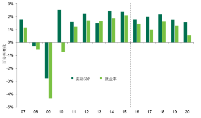 该图从宏观经济的角度分析,一个是实际的GDP,一个是就业率。实际的GDP和就业率,实现了一个稳定的增长。