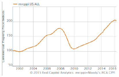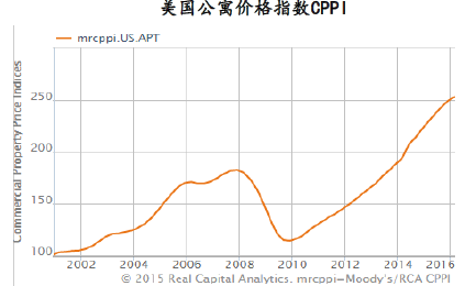 这张图是CCPI,这是美国综合房地产的指数,包括各种商业地产。从2000年到现在,长周期美国房地产市场整体继续上涨,价格超过金融危机前的高点,目前进入繁荣期。