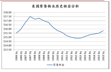 零售市场如图所示,零售的租金从2008年开始逐年下降,至今没有恢复到金融危机前的水平。