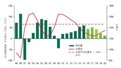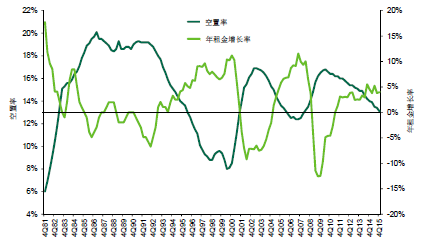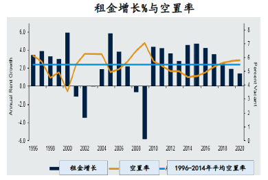 公寓市场如图所示,租金增长和空置率。租金我们注意,从2010年开始,是以年均4%的速度持续地增长一直到现在。浅蓝色这条线是从1996年开始到现在,过去20年平均的空置率,目前来讲公寓的空置率还是低于长周期的平均水平的,这是比较健康的态势。