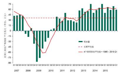 从2013年开始,每年吸纳量都高于历史平均水平,而且这个趋势保持非常稳健的态势。红色虚线是从1985年开始到现在历史平均的水平。