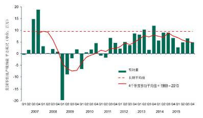 这张图,净吸纳量从2010年开始超过供应量,一直保持这个态势,浅色柱状图明显高于深色的图,持续到2014年,2015年出现小小的反转,但还是出现比较强劲的反转,这个势头会持续。