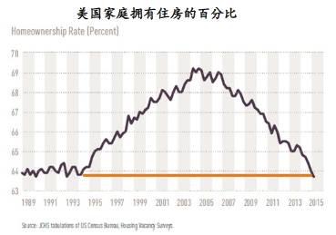 关于这个市场的分析,如图,哈佛大学的统计,美国家庭拥有住房的百分比,已经跌到了1993年的水平了。