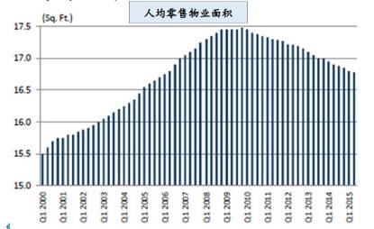 该图是美国人均零售物业的面积。我们可以发现从2000年开始是逐年上升的,一直到2010年,2010年以后发生了一个逆转,从这一年开始,人均物业面积是一直下降的,这个趋势非常明显,我们认为电子商务持续改变人的消费习惯,对传统购物商场造成非常大的冲击。目前美国的REIT市场体量来说最大的第一名是Simon, 做零售的,但是这个趋势不会持续了,基本面已经发生了逆转。
