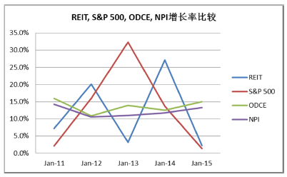 这张图时间周期稍微短一些,基本上得出的结论是基于更多的数据,用这个图作为一个代表。REIT和S&P500波动比较大,两者的相关度是比较高的,而REIT和房地产实物资产相关度是比较低的,比较平滑的两条线是刚才说的ODCE和NPI的指数。