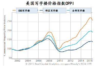 我们再看一下价格,从价格上来看,目前写字楼的价格指数CPPI,浅蓝色是全部写字楼CPPI的指数,从2000年到现在,橙色是CBD写字楼,深蓝色是郊区写字楼。很明显目前整体来讲价格超过2007年的高点,CBD写字楼显著高过2007年的高点。
