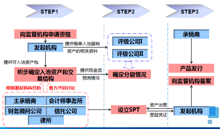 如上图,发起机构先要向监管机构申请资格,之后会将每单入池的基础资产发给各个中介机构,包括评级公司、会计师事务所、法律顾问等,接着,中介机构会对这些资产进行尽调审核,确定初步的资产包,之后,各方共同讨论产品交易结构,评级机构再根据交易结构和现金流预测情况对产品进行分层,分层之后就可以设立SPT,发行产品。