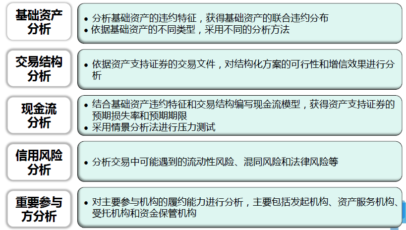 如上图,证券评级考虑三个方面的因素,第一是基础信用分析,包含资产池分析和现金流分析两个方面;第二是交易结构分析,这也是围绕着现金流分析来进行;第三是参与方分析,包括受托机构、发起人、托管行等等。