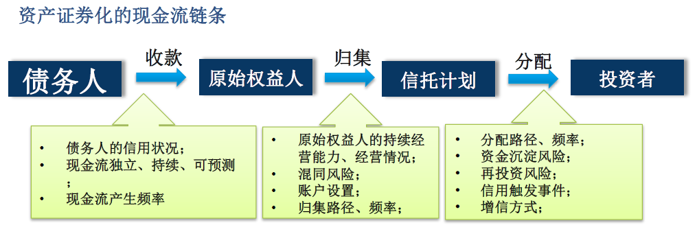 上图是典型的ABS交易结构图,对交易结构的评价最关键的是未来现金流的安全性,对融资人来说,是用其未来的现金流折现融资;对投资者来说,其当前投资及未来收益完全依赖于未来现金流的安全性,因此资产证券化一切结构设计都是围绕如何最大程度缓释在现金流流动路径(包括起点)上可能出现的风险来设置。