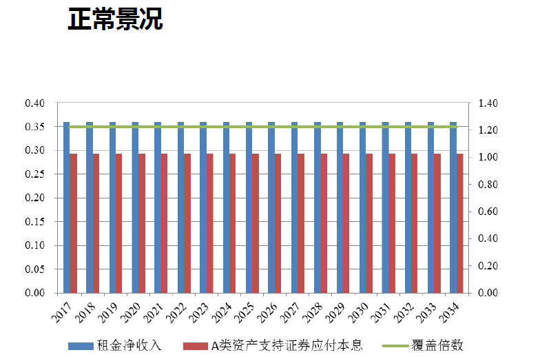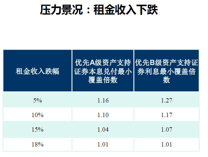 我们测算正常情况下以及压力情况(租金收入下跌)下的覆盖倍数。分析测算计划存续期内的租金收入水平、未来皖新租赁按期回购以及公开发行资产处置。按照现金流入的大小和时间的分布,去匹配优先A档的本息,然后测算覆盖倍数。(如下图)