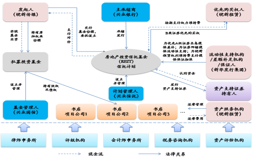 (2)底层交易结构。该项目引入了SPV和项目公司两层的交易结构安排。如图,发起机构皖新传媒作为基金份额的投资人和基金管理人,设立了一个私募基金,这个私募基金向皖新传媒收购它持有的五个SPV的100%的股权。这五个SPV分别持有目标资产原持有人以他们项下的目标资产设立的五个项目公司的100%的股权。然后,私募基金向SPV发放委托贷款,SPV再将自有资金及委托贷款向目标资产的原持有人支付股权和对价款。接着,皖新传媒以基金份额作为委托财产委托给信托,然后设立房地产投资信托基金。物业的净租金收入优先用于支付优先A档的本金和预期收益。
