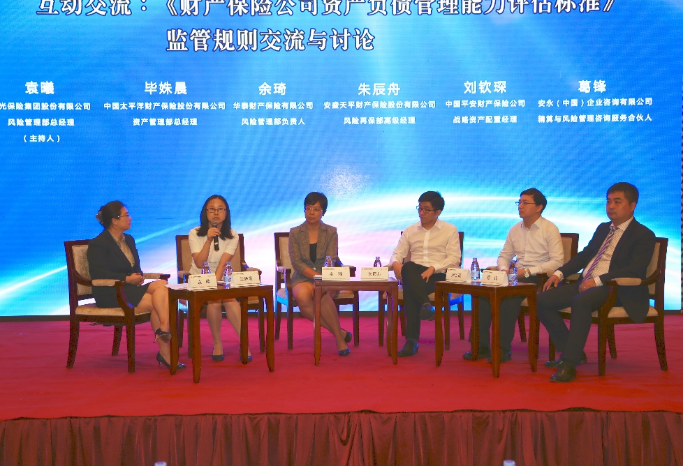 财产险资产负债管理能力评估专题研讨环节由阳光集团风险管理部总经理袁曦主持,太保财险资产管理部总经理毕姝晨、华泰财险风险管理部负责人余琦、安盛天平风险再保部高级经理朱辰舟、平安财险战略资产配置经理刘钦琛、安永精算与风险管理咨询服务合伙人葛锋分别就资产负债管理在对提升保险机构管理能力、提升公司价值的重要意义方面发表了各自的见解,并针对本次资产负债管理监管规则带来的机遇和挑战展开了讨论。