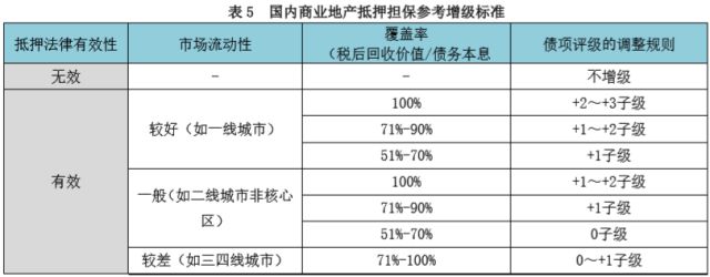 由于市场流动性和税收等因素对商业地产抵押回收价值影响很大,可能出现有价无市的情况,或出现如果土地取得成本很低扣除税费后的价值会很低。因此,根据资产类别以评估价值为基础打折的处理方法过于粗糙,甚至严重高估或低估增信效果。对商业地产抵押增信效果评估,仍需围绕抵押物回收价值、覆盖率和抵押有效性进行评估,并细化标准。