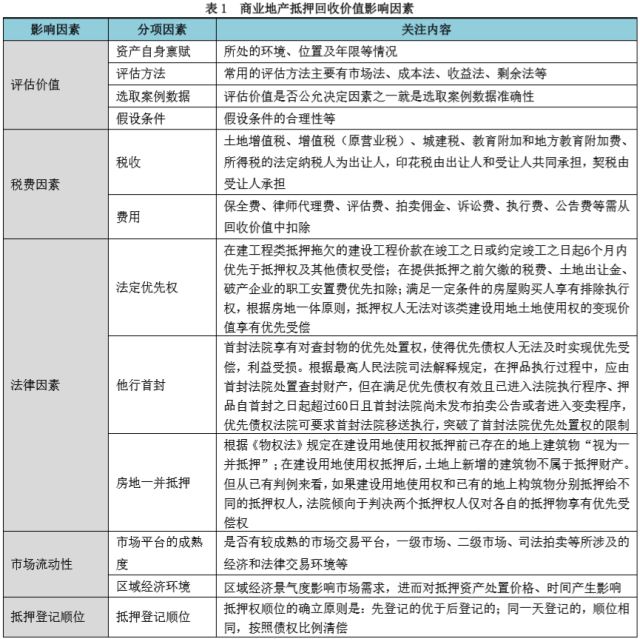 商业地产抵押回收价值评估是对其在强制变现情景下处置价值的评价,不同于正常市场条件下的市场价值,但回收价值分析又必须依托于正常市场情境下价值形成的判断。回收价值影响因素包括评估价值、税费因素、法律因素、市场流动性及抵押登记顺位等,有的因素直接影响回收价值,有的因素通过影响回收时间间接影响回收价值(见表1)。