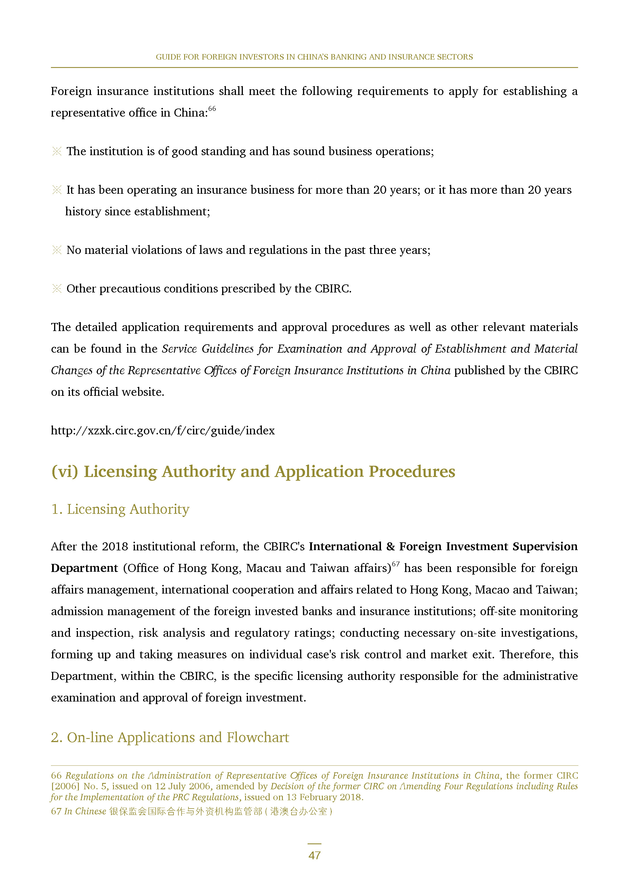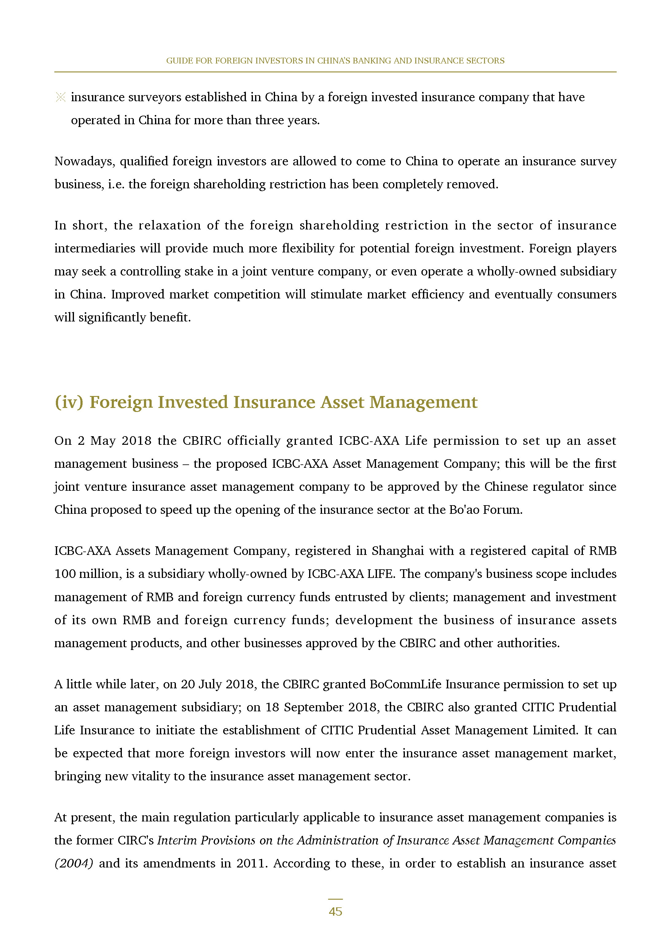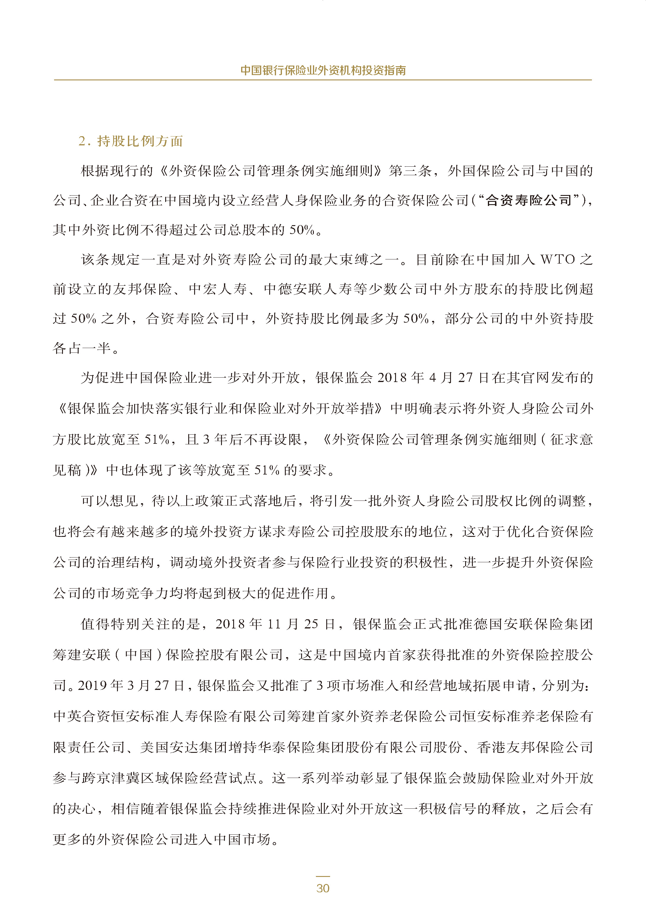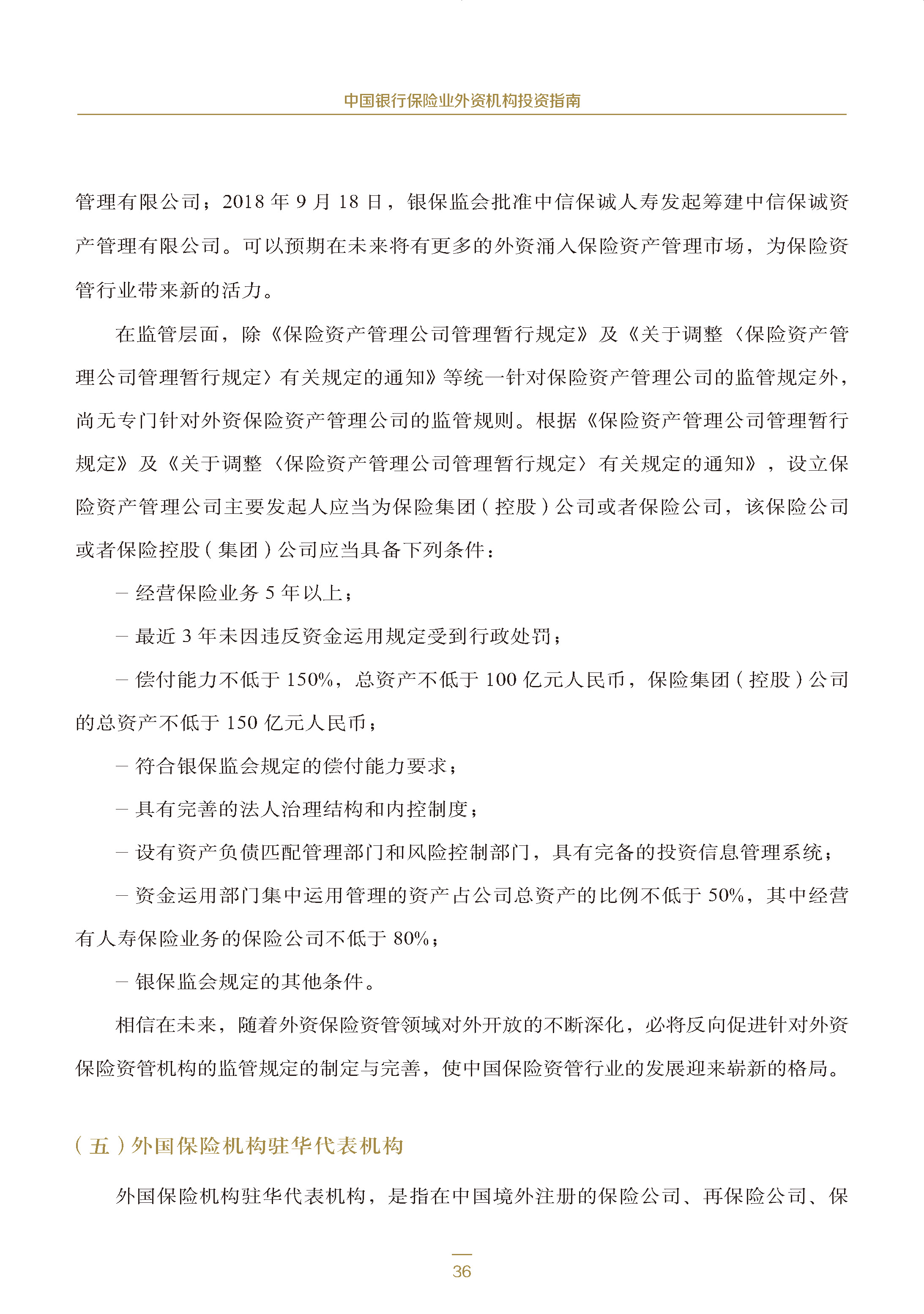 为进一步加强中国保险资产管理行业的国际化建设平台,协会组建了IAMAC国际专家咨询委员会并于2019年5月21日在北京召开委员会成立大会,同时,在当日举办了第一届IAMAC资产管理发展论坛(以下简称“论坛”)。在本届论坛上,协会隆重发布《中国银行保险业外资机构投资指南》(以下简称“指南”), 旨在满足会员单位及外资机构对中国银行、保险业对外开放政策及相关业务规则了解的需求。《指南》(中英文版)的编辑工作得到了通力律师事务所的大力协助,结合了各金融监管机构已经公开颁布的相关政策及业务规则,从银行业和保险业对外开放的历史、行业的监管政策、投资及外汇税收政策、在中国设置机构的要求及申请流程以及持续合规义务等八个方面进行了阐述,从实际操作的角度作了较为全面的政策介绍, 为外资机构了解中国相关政策提供了较为完整的信息借鉴。现将《指南》中英文版在协会公众号上逐期发布,共八期,以飨读者。