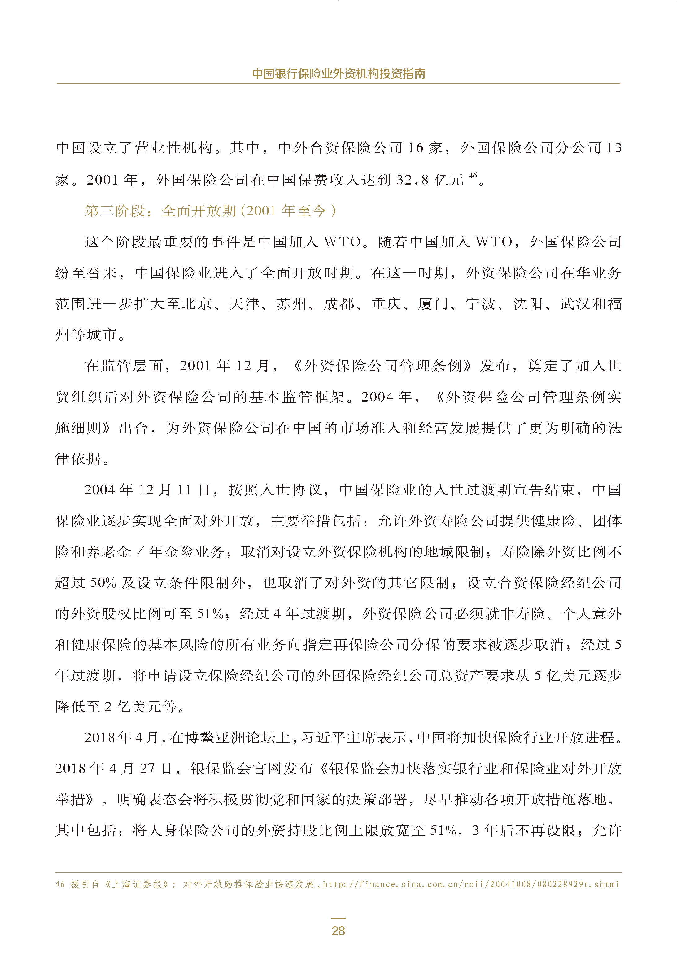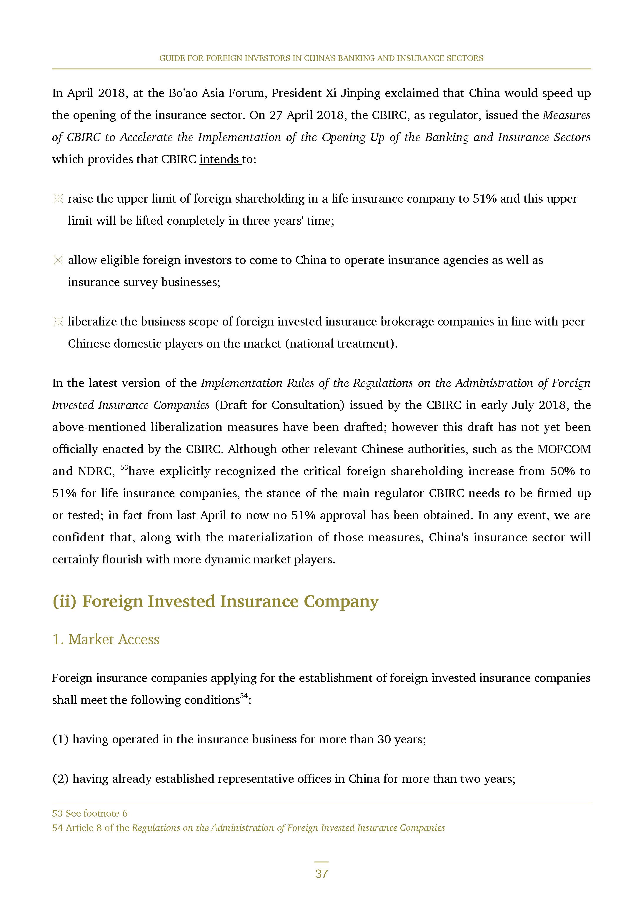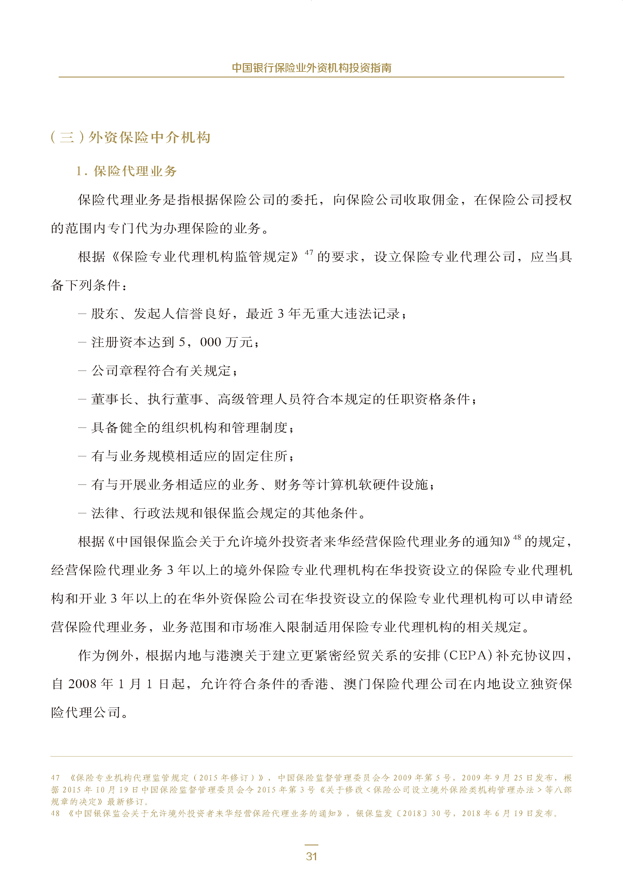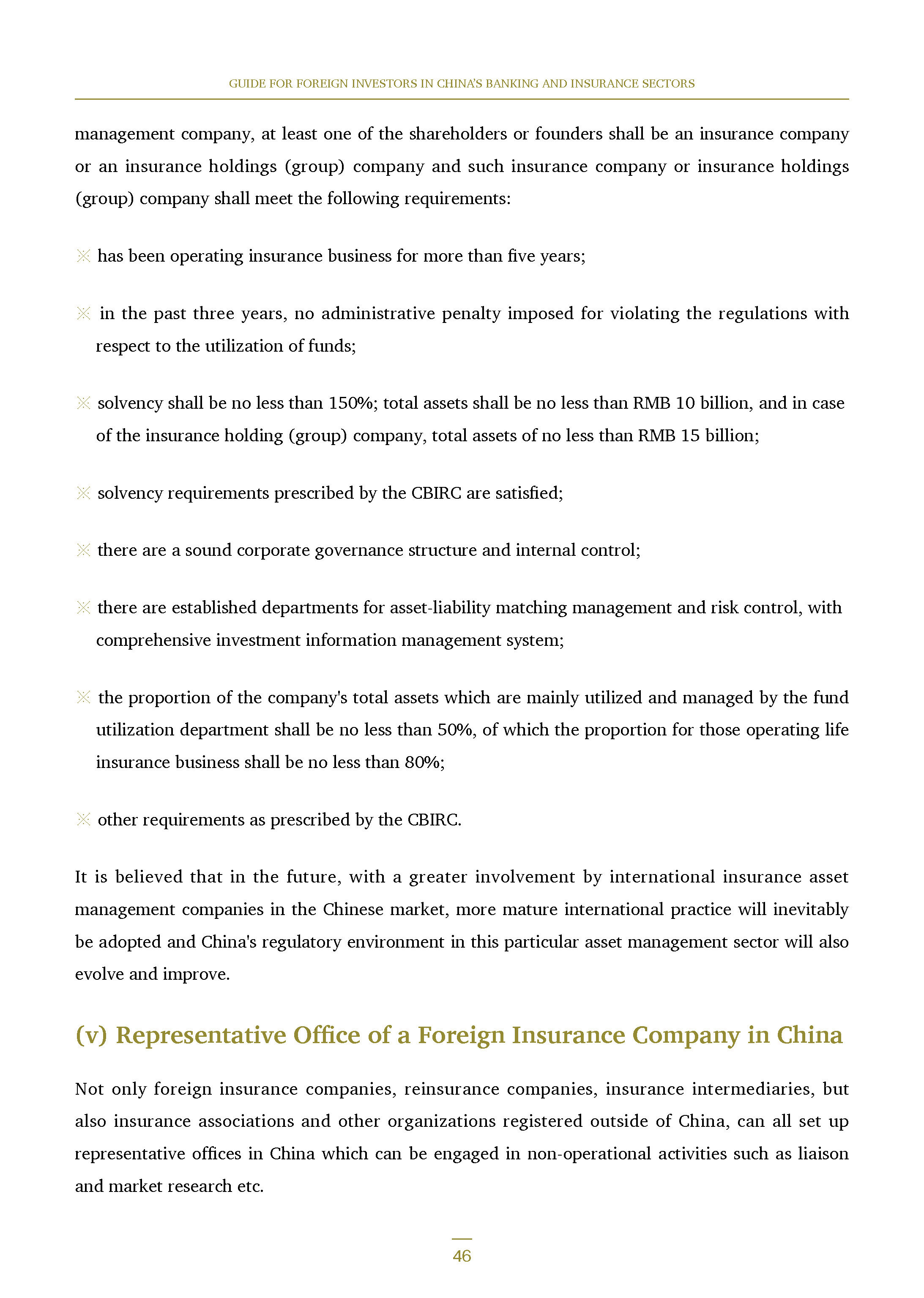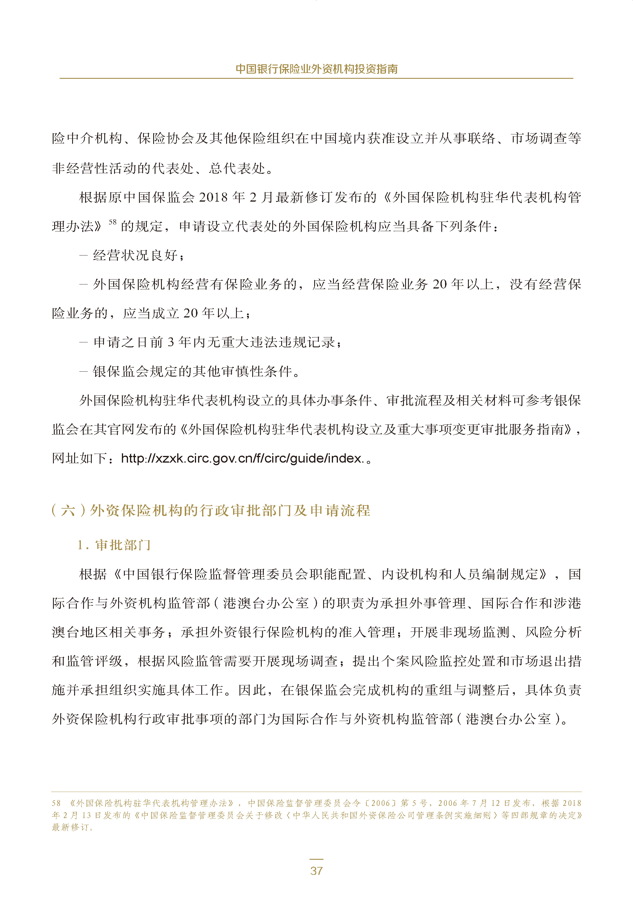 为进一步加强中国保险资产管理行业的国际化建设平台,协会组建了IAMAC国际专家咨询委员会并于2019年5月21日在北京召开委员会成立大会,同时,在当日举办了第一届IAMAC资产管理发展论坛(以下简称“论坛”)。在本届论坛上,协会隆重发布《中国银行保险业外资机构投资指南》(以下简称“指南”), 旨在满足会员单位及外资机构对中国银行、保险业对外开放政策及相关业务规则了解的需求。《指南》(中英文版)的编辑工作得到了通力律师事务所的大力协助,结合了各金融监管机构已经公开颁布的相关政策及业务规则,从银行业和保险业对外开放的历史、行业的监管政策、投资及外汇税收政策、在中国设置机构的要求及申请流程以及持续合规义务等八个方面进行了阐述,从实际操作的角度作了较为全面的政策介绍, 为外资机构了解中国相关政策提供了较为完整的信息借鉴。现将《指南》中英文版在协会公众号上逐期发布,共八期,以飨读者。