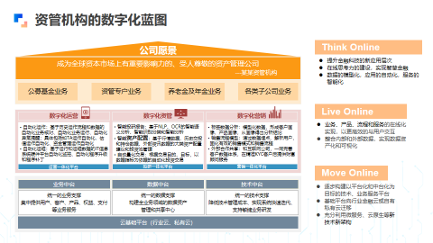 我们认为一个数字化的发展过程,有Think Online、Live Online、Move Online三个方面。Think Online即如何用科技形成生产力。Live Online是如何在在线网络的环境下进行整个组织、流程和体系的重构。这两个升级需要基于云服务,云原生和互联网微服务的基础体系升级,也就是Move Online。在这样的基础上重构解决方案和业务流程、管理流程,甚至涉及到组织架构的重构,进一步在大数据和AI能力的基础上提升生产力、投资能力和风险管理能力。