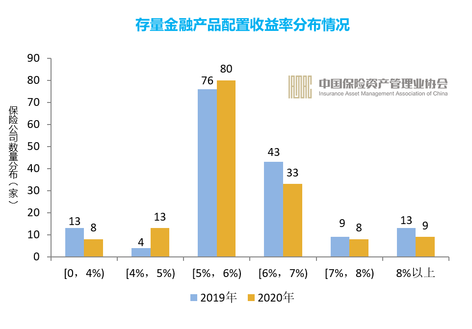 2020年,参与调研的保险公司存量金融产品投资收益率集中分布在5%-6%。