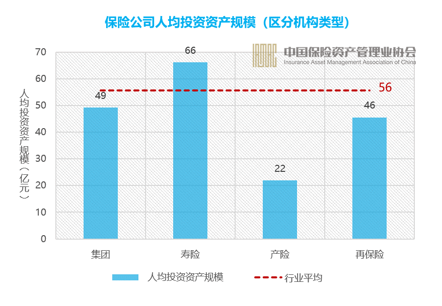 2020年,参与调研的保险公司投资人才的人均投资资产规模为56亿元,较上年增长12%。其中,寿险的人均投资资产规模最高,达到66亿元。