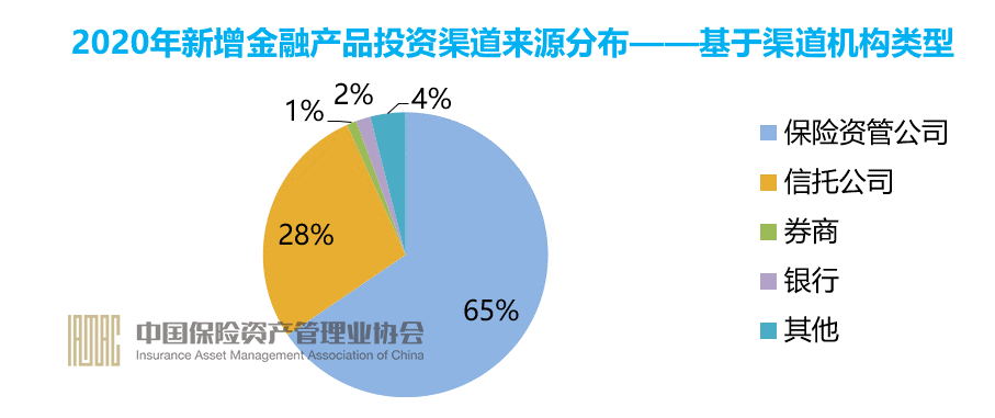 2020年,参与调研的保险公司新增金融产品投资渠道来源以保险资管公司和信托公司为主,分别占比65%和28%。