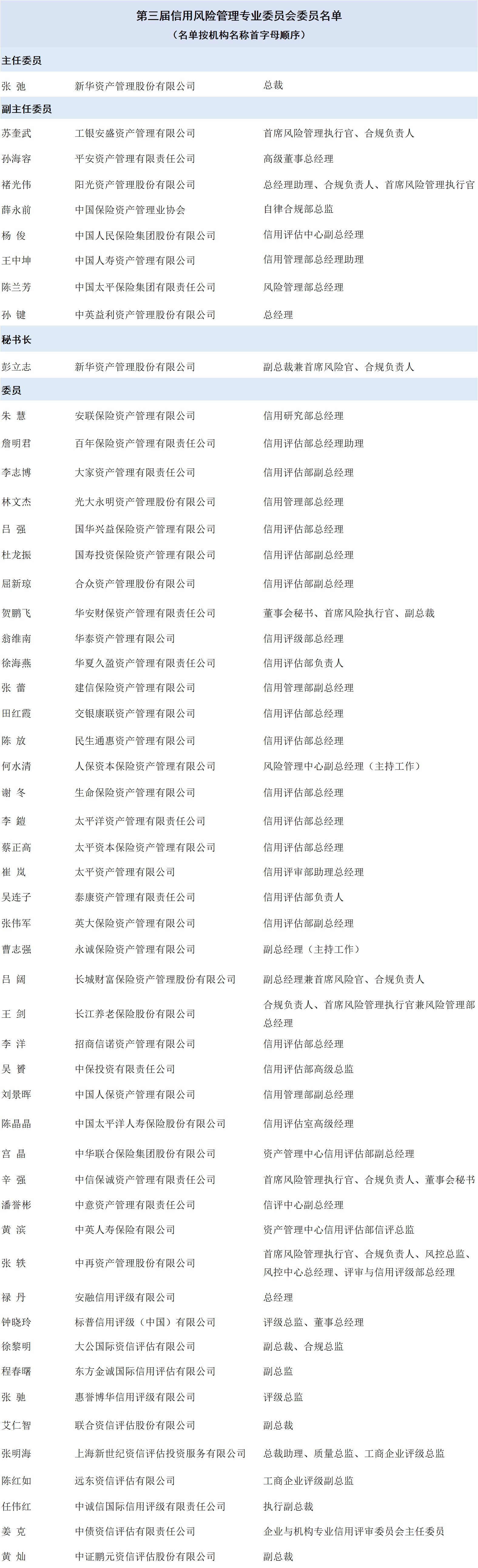 曹德云在会上宣布第三届信用风险管理专业委员会正式成立。第三届信用专委会主任委员由张弛连任,中英益利资产总经理孙键,平安资产高级董事总经理孙海容,阳光资产总经理助理、合规负责人、首席风险管理执行官褚光伟,人保集团信用评估中心副总经理杨俊、国寿资产信用管理部总经理助理王中坤、太平保险集团风险管理部总经理陈兰芳、工银安盛资产首席风险管理执行官、合规负责人苏奎武、协会自律合规部总监薛永前等8人担任副主任委员,新华资产副总裁兼首席风险官、合规负责人彭立志担任秘书长,保险机构和评级机构代表共43人担任委员。