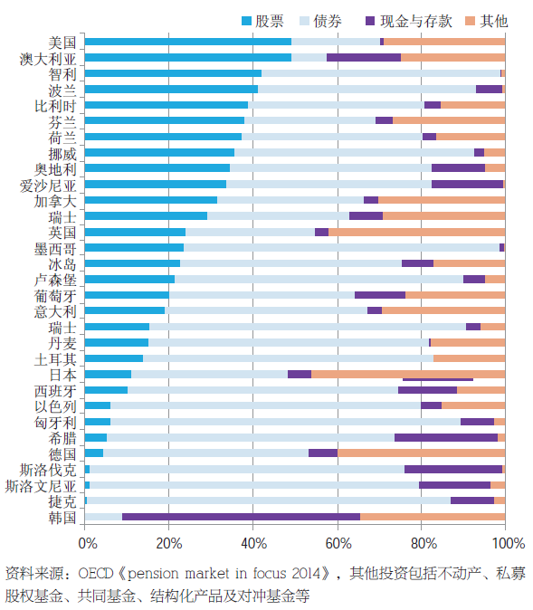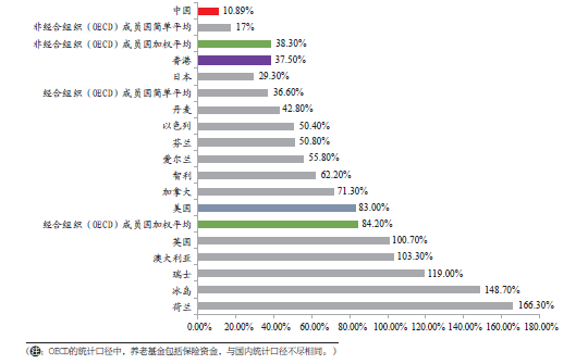 目前,我国养老金基金规模还比较小。我国已实现市场化运作的养老金基金为社保基金和企业年金基金,截至2014年底总规模超过2万亿,其中,社保基金资产总额15356.39亿元,企业年金基金为7688.95亿元。从国际比较情况来看,根据OECD(经济合作与发展组织)统计数据,截至2013年底,我国养老基金占GDP比重11%,而美国养老基金占GDP比重83%,OECD成员国加权平均占比84.2%,香港占比37.5%,非经合组织成员国加权平均占比38.3%(见图1)。与这些国家和地区相比,我国养老金基金规模还比较小。随着养老保障体系的不断完善,
