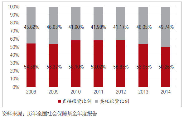 社保基金采用高度集中的受托运营管理模式,由社保基金理事会管理,实行直接投资和委托投资相结合的投资方式,近几年的投资分配比例大致如图2所示。