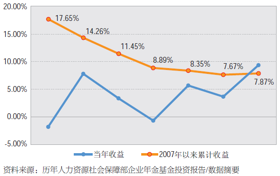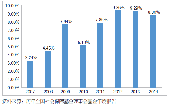 历经近十年发展,企业年金基金规模实现稳步增长。截至2014年末,企业年金基金规模达到7688.95亿元,较2006年底增长了7.45倍。虽受到2008年、2011年资本市场大幅波动影响,但从长期看年金基金市场化投资运营运作仍然取得了稳健的投资回报,自2007年以来的年化平均投资收益率达到了7.87%(见图5)。