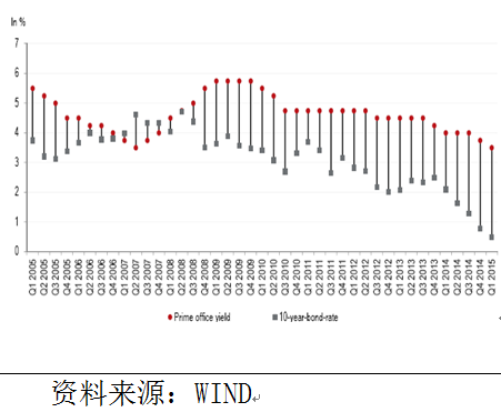 各国实施量化宽松政策导致利率水平普遍走低,投资不动产所获得的租金收益率明显高于债券;进行不动产投资时可考虑利用境外融资成本低的优势,发挥杠杆效应,进一步提高收益水平(见图5、图6)。