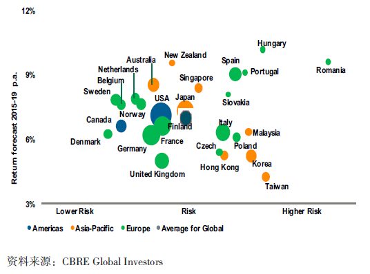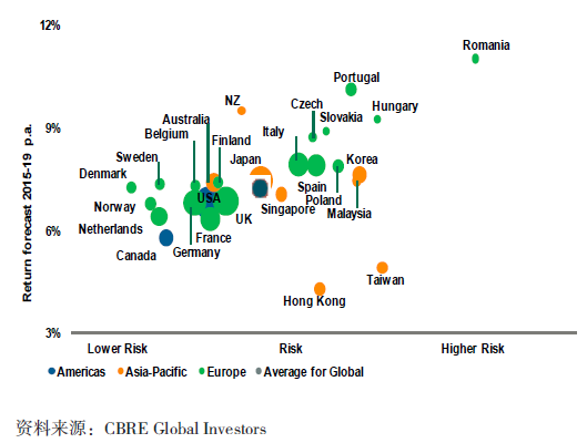 图7:各国办公楼收益和风险分析(2015-2019)
