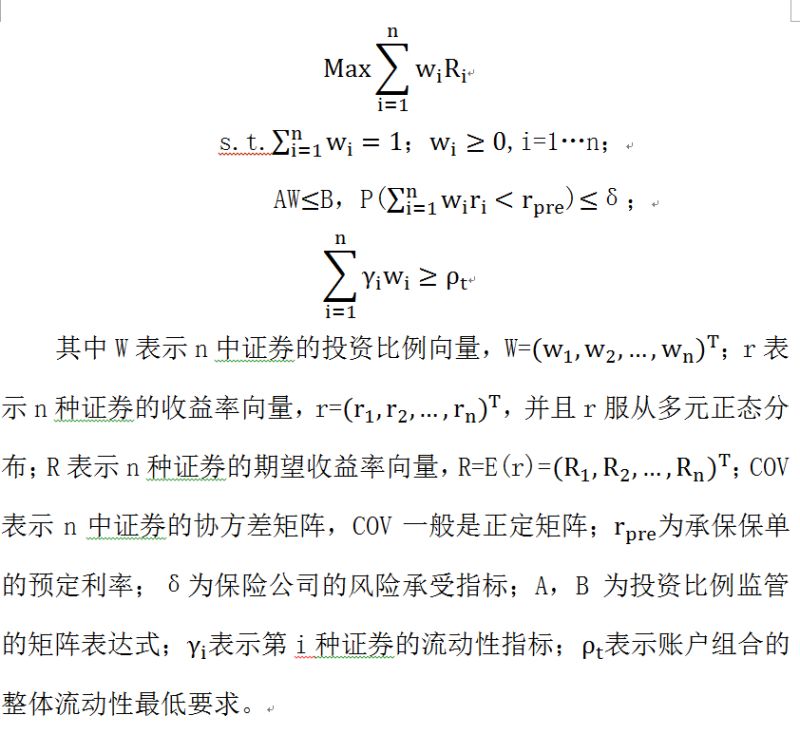 二是传统Markowitz模型的优化和改进:(1)根据监管要求,加入相应的投资比例限制;(2)用利差损的发生概率来代替简单的标准差计算,利差损指投资组合的回报率低于保险产品的预定利率;(3)加入流动性限制。