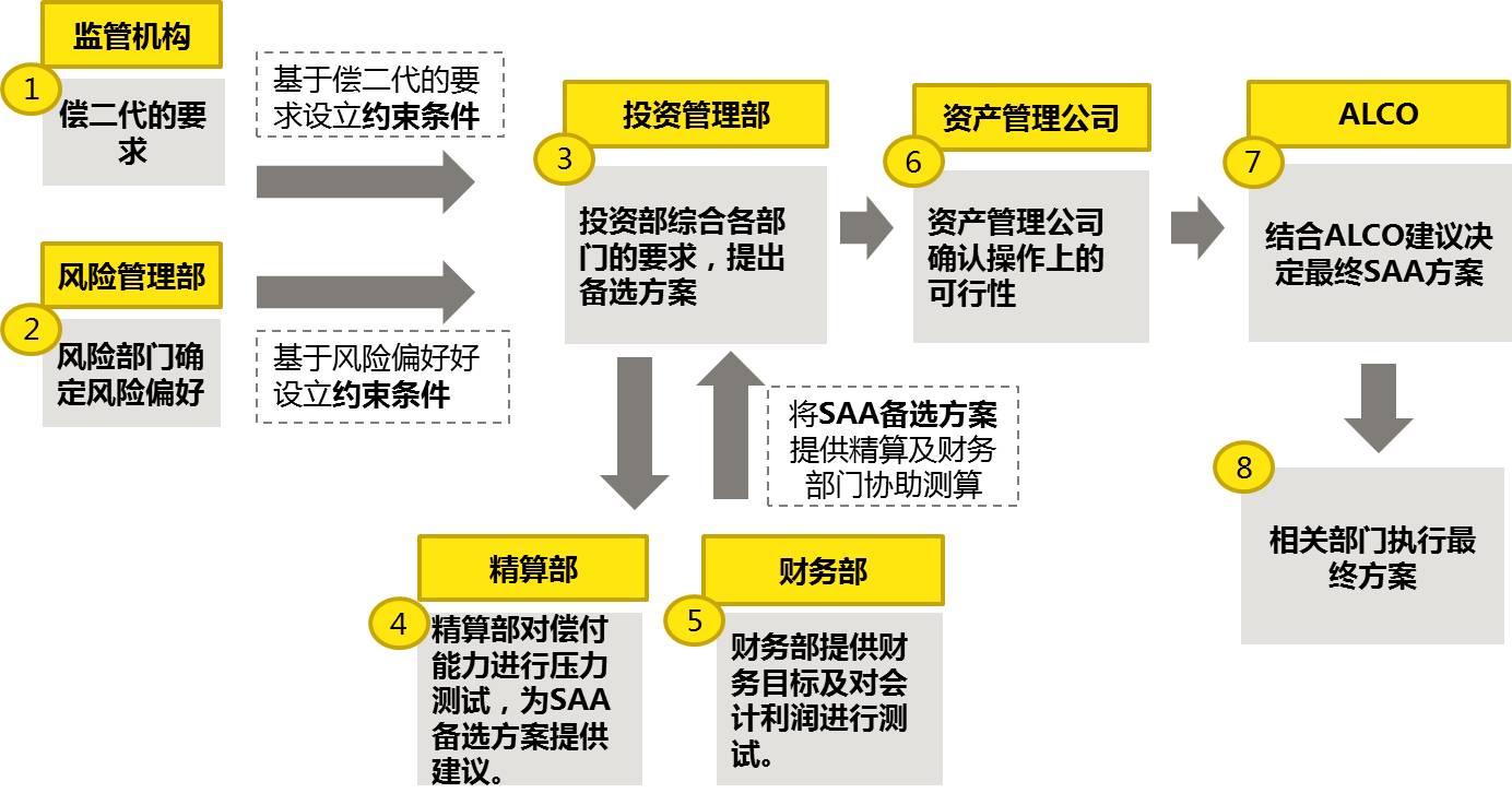 4.精算部门/风险管理部门对偿付能力、内含价值等公司层面核心指标进行压力测试,筛选出不满足风险偏好及限额的方案,为SAA备选方案提供建议;