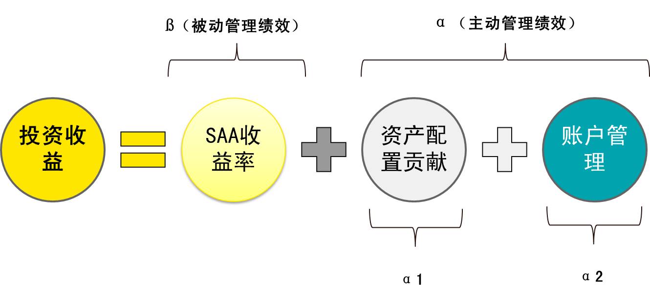 其中,SAA收益率代表综合考虑偿二代各方面约束要求后的战略资产配置,即被动管理绩效。资产配置贡献是指年度资产配置基准收益率超越中长期战略资产配置基准收益率,即主动管理绩效α1。账户管理贡献是指受托人对个别资产类别基准的超额贡献,包括动态和战术资产配置的贡献、风格资产选择贡献、择时贡献等,即主动管理绩效α2。只有构建这种收益和责任对等的考核指标体系,才能有助于保险机构资产端和负债端的有效沟通,资产负债管理工作进入良性循环。