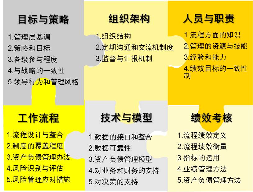 上述每一个技术要点都对应着偿付能力风险管理评估中的分数,从而也会直接影响公司的偿付能力充足率。实务中要满足这些要求,保险公司就必须建立以风险管理为主轴,以投资策略、产品策略和资本管理策略为分支的资产负债管理体系。将风险管理的理念嵌入资产配置策略、流动性管理策略、产品设计策略、新业务销售策略、分红万能险结算策略、资本规划与配置策略等流程中。