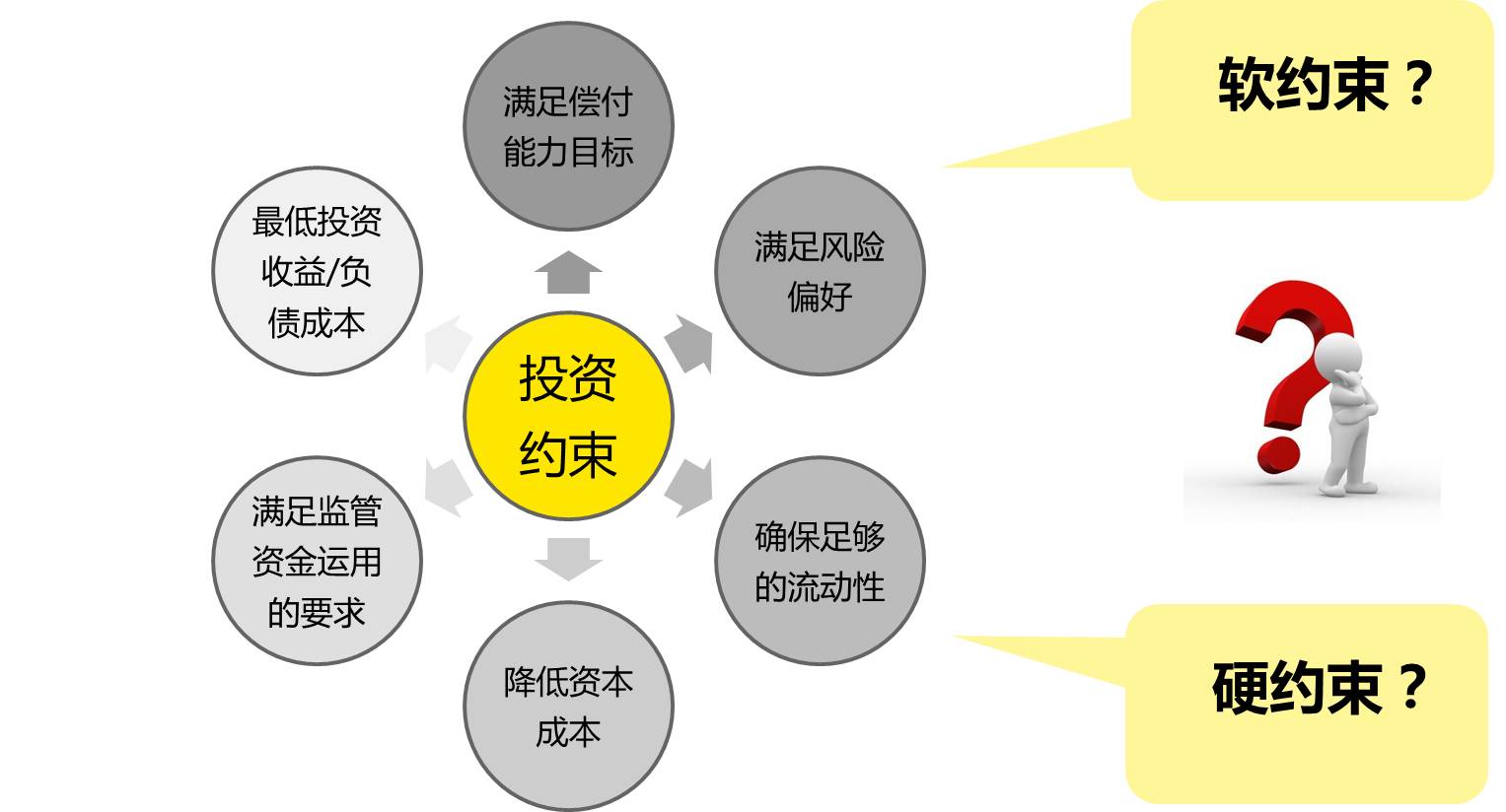 1.对于监管机构资金运用规则对资产大类的上限要求、公司自身的负债成本或设定的最低投资收益,不论在什么情况下,通常都是资产配置必须遵守的硬约束。