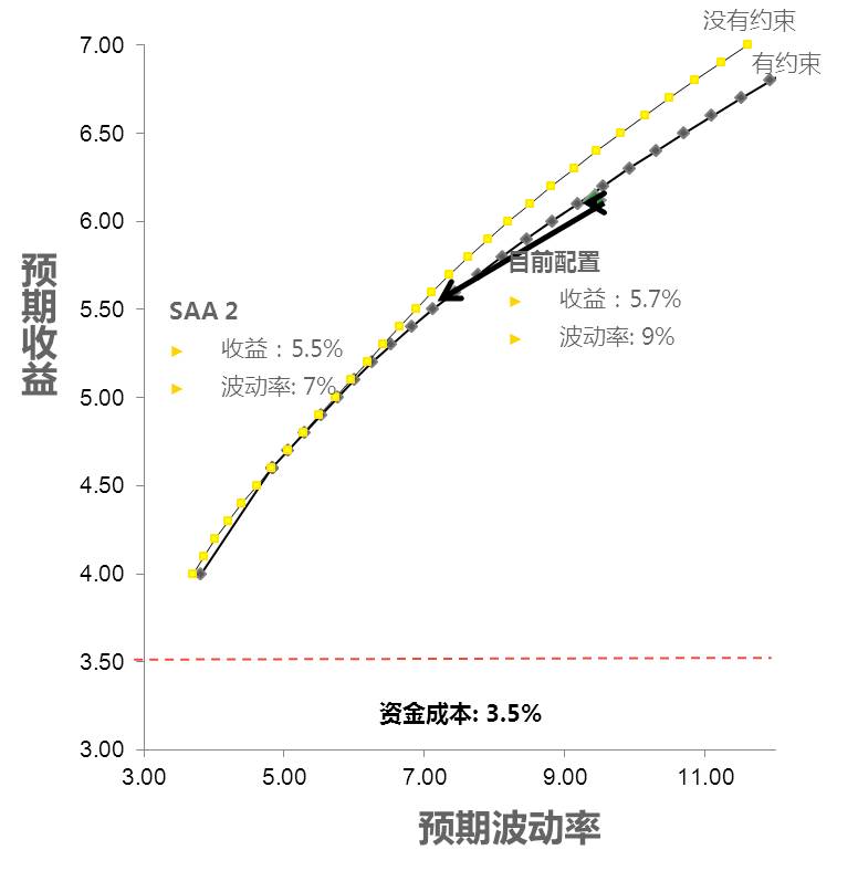1.在设定资产配置的约束条件时,考虑监管机构针对资金运用、偿二代等方面的硬性规定,包括计算各投资资产的资本成本等;