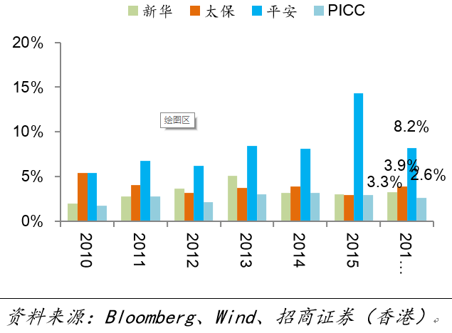 除了股票价格(指数)的回报,保险公司权益类投资还有较为可观的股息回报。虽然在投资者印象中,A股的分红率低,但是中资保险公司权益类投资配置十分注重股息收益率,而且过往取得了还非常不错的股息回报。我们以平安和PICC为例,2010-2015年,平均来看,股息收入对总投资收益的贡献均超过了10%。按照整体权益类投资的股息收益率来看,PICC在2010-2015年之间的股息收益率平均值为2.6%,而平安同期数值竟然高达8.2%。平安2010-2015年的权益类投资的股息收益率的平均值远远高于其同期总投资收益率(5%),我们认为这一点得益于平安良好的资产配置:其一,平安非常重视股权类投资的股息收益率;其二,平安之前较早地配置了较多长期股权投资如上海家化和平安银行等。