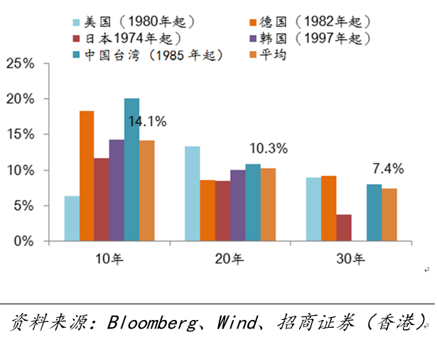 自从人民日报刊登权威人士关于中国经济将长时间保持L型的文章以来,市场已对L型经济做出了很多探讨。我们关注经济增速平台下降后较长时间内权益市场的表现,并寄希望以此来为我们判断保险公司权益类投资收益率做一定的参考。我们通过研究发现,美国、德国、韩国和中国台湾在经济增速平台下降和转型成功后,资本市场在较长一段时间内都有不错的表现。日本在70年代中期经济转型成功后,资本市场也表现不俗,但在80年代后期日元升值带来的泡沫经济破灭之后,日本经济陷入了20年的迷失,股市也从此一蹶不振。纵观各国家和地区在经济转型增速换挡中的资本市场表现(见图1),如果以经济转型为起点来看,转型后10年、20年和30年,美(1980年开始)、日(1973年开始)、德(1982年开始)、韩(1997年开始)和中国台湾(1985年开始)主要指数平均复合回报分别为14%、10.3%和7.4%。即便是后来经济泡沫化的日本,如果按照1974年作为其经济转型的起点,其股指10年、20年、30年和40年年均复合回报分别为11.6%、8.5%、3.7%和3.9%。如果中国能稳步推进供给侧改革和产业转型升级,我们认为未来20年甚至30年更长的时期内,中国主要股票指数完全有可能实现年均5%以上的长期复合回报。