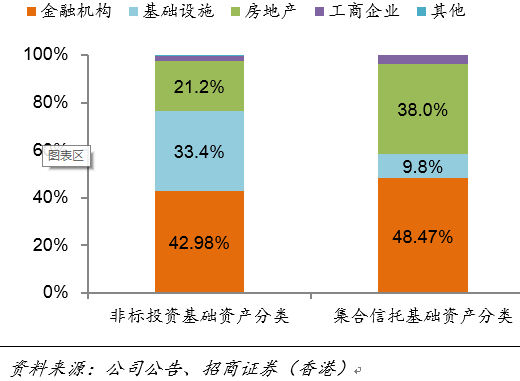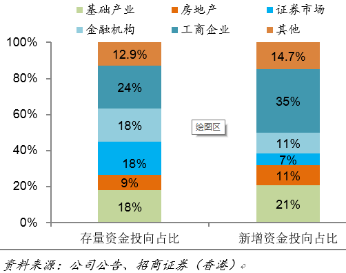 由于保险公司信托和债权计划投资并不分不同项目披露,因而投资者一直误认为保险公司信托投资的不良率与信托行业一致。我们认为保险公司的信托投资的不良率远低于信托行业的整体水平,主要原因是保险公司的信托和债权计划主要投资在金融机构和基础设施等不良率较低的行业,因而其隐含信用风险要低很多(见图7)。我们测算,在较极端的情况下,如果信托业整体不良率达到15%,新华保险的信托和债权计划投资的不良率也仅有5%左右。通过银行业贷款分行业的不良率数据,我们发现金融业、房地产业和基础设施和公用事业等行业的不良率远低于整体不良水平。按照2005-2014年十年平均数据看,金融业、房地产业和基础设施以及公用事业行业的不良率仅为整体的18%、64%和40%。我们依据新华保险2014年末公布的3Q14信托投资行业的大体分布,大体估算出新华保险信托投资约46%投入了金融业,约30%投入了房地产行业,约22%投入了基础设施行业。整体看,新华保险的信托投资95%以上都投入了风险较低的行业(见图8)。特别值得一提的是,保险公司在投资房地产信托的时候,对交易对手是有严格筛选的,因此可以判断保险公司的房地产信托的不良率要远低于房地产信托子行业。如果我们假设信托投入金融业的不良率为2%、房地产行业的不良率为12%、基础设施行业的不良率为4%,基础产业、工商企业和其他产业的不良率为20%,那么信托业整体的不良率水平将达到15%左右。由于保险公司房地产信托的资产质量较信托行业优秀,如果我们假定其房地产信托不良率为9%,其他行业不良率与信托行业一致,我们估算出新华保险的信托投资不良率大约在5%左右,仅为信托行业的三分之一。
