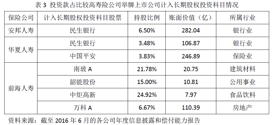 在权益类资产配置占比较高的寿险公司中,安邦人寿、华夏人寿和前海人寿等都是近些年来举牌上市公司的主力。保险公司举牌上市公司的目的可能不同,险资特别是中短存续期的万能险资金举牌上市公司的动机可概括为四个方面:一是持股上市公司股份20%以上(或5%以上并进驻董事等形成重大影响)可将持股用权益法计入长期股权投资科目,按持股比例分享举牌公司的净利润,二级市场估值的波动将不会影响保险公司的偿付能力充足率和净利润等指标的波动。二是根据“偿二代”监管制度,长期股权投资科目下的最低资本占用要明显低于交易性金融资产和可供出售金融资产科目的最低资本占用。对于前两点,目前部分寿险公司已采用这种会计处理方式(见表3)。三是在市场利率持续下行压力带来的资产配置荒背景下,股票等权益类资产经过一年多的去杠杆,部分优质股票的估值已经具备较高的相对配置优势。四是随着负债端和投资端的不断放开,“新政”下保险公司举牌上下游行业中的房地产、汽车、银行等行业优质标的,以发挥战略协同发展作用。