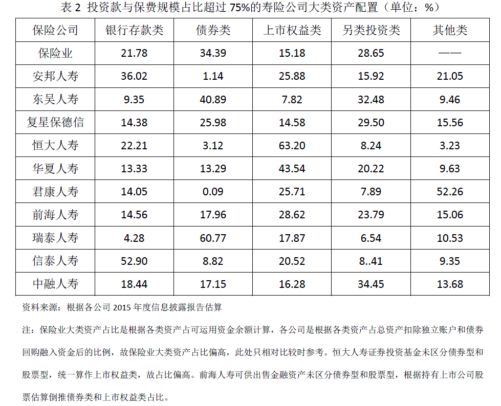 三、中短存续期万能险资金配置现状保险资金配置是一个兼顾收益性、流动性和安全性三原则的动态配置过程。中短存续期万能险资金表现出高流动性、高投资收益率和存续期限较短的特点,要在预期风险预算的情况下实现上述目标并非易事。鉴于无法通过公开渠道获得我国各家寿险公司万能险资金的配置情况,考虑到中短期存续期万能险资金多数以投资款的形式进行会计处理,本文通过对2015年底投资款与保费规模占比超过75%的寿险公司的资产配置情况来替代观察万能险资金的配置现状(见表2)。