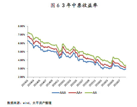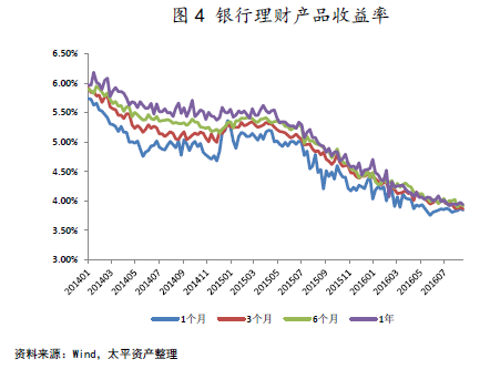 银行存款方面,三年存款基准利率已降至2.75%。据不完全统计,目前三年、五年存款利率最高上浮至3.25%、3.30%(见图3)。银行理财收益率则反映了银行所能接受的最高资金利率,14年以来理财收益率持续下行,全行业1年期产品已降至3.94%,大型、高评级银行的理财收益率则还要低20BP左右(见图4)。