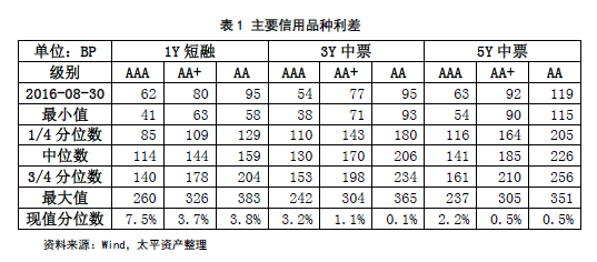 债券持有和交易收益率持续下降。10年国债和国开二级市场收益率已跌破2.7%和3.1%关口,约2003年来最低;一级市场10年国债和国开已最低跌至2.74%、2.99%,前者的认购倍数由去年约2倍上升到今年3-4倍。信用债收益率和利差持续走低,三年中票AAA、AA+、AA级收益率最低至2.86%、3.09%、3.31%,约2009年3月来最低,信用利差则均处于1/4分位数内,且接近于最小值。目前配置的持有到期收益率水平已接近历史低位,交易性收益则面临不确定性、信用和期限利差扩大风险(见图5、图6、表1)。