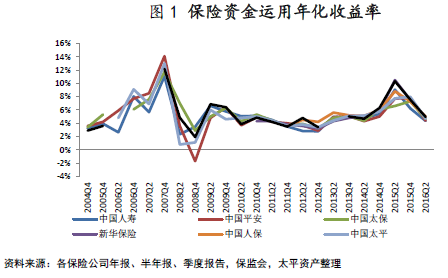 二、保险资金投资收益现状及趋势总体看,保险资金历史平均年收益率为5.28%,2007-2008年大幅波动主要受到A股走势影响,其后维持在3.4%-5%区间。2014年以来,随着投资范围不断放开,收益率稳步上升,但受股票波动影响仍较大。2015年末行业年化收益率从二季末的10.32%高点回撤至7.56%,今年一、二季度则进一步降至4.80%、4.94%(见图1)。