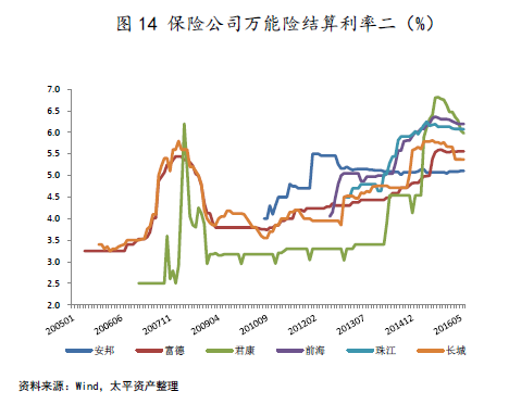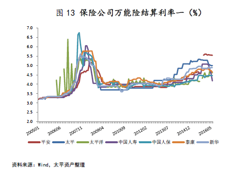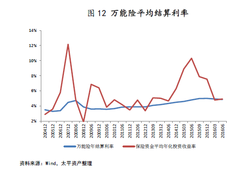 对于万能险的资金成本,其结算利率截至6月底平均在4.88%左右。2015年随着短期理财收益率持续下行,万能险作为替代型产品为抢占市场,收益率节节攀升,部分险企将万能险作为短期理财产品运作、通过互联网渠道销售以扩大规模,更是进一步推升了结算利率,2015年底达平均5.02%。从历史走势看,相对于投资收益率的波动,结算利率变化平稳,且除了2008年股市大跌时的回调外,主要呈现趋势向上态势,显示万能险市场竞争格局弱化了其结算利率的弹性。2015年下半年以来,保险投资收益率较大幅度下滑,而万能结算利率则相对平稳略有下降,截至2016年6月底,4.88%的结算利率与4.94%的投资收益率相差无几,3月底时甚至出现了倒挂(见图12)。