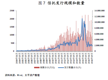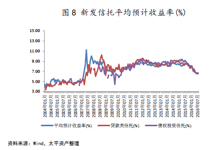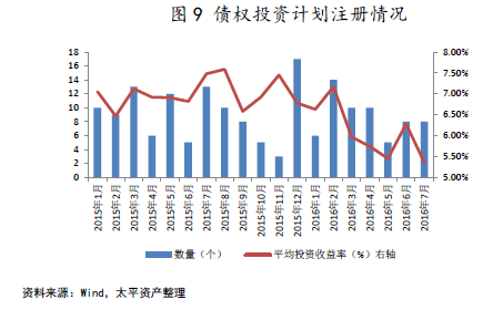 债权类非标资产方面,呈现供给缩小、需求扩大、利率下行、质量下行的结构性资产荒特点。从供给看,非标资产呈现明显的规模、数量、收益率下降态势。目前信托发行数量已从2014年高点迅速降至2010-2011年水平(见图7)。收益率方面,险资主要的非标投向中,(1)信托的平均收益率自去年3月来已降至2009-2010年水平(见图8);(2)债权投资计划自年初以来数量、收益率都趋势下行,截至7月底平均收益率已降至5.36%(见图9)。从需求看,一方面地方债持续推进和银行大型企业贷款维持较高增速吸收了一大部分非标债权项目,另一方面随着银行理财、保险机构等资金方2013-2014年配置的非标资产集中到期,再配置压力显著上升。在供给规模和收益率双降而需求上行背景下,债权类资产获取过去持续稳定高收益的难度加大。