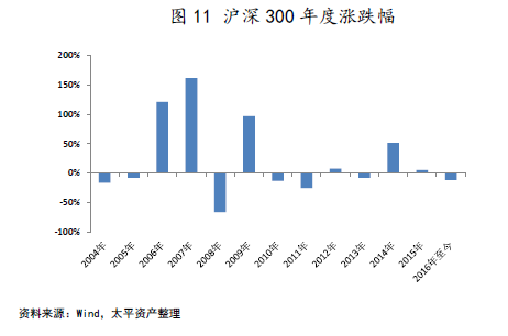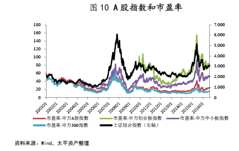 股票方面,A股波动性较大,呈现熊长牛短的特征,历史上仅有2007年1月至10月、2008年10月至2009年8月、2014年7月至2015年6月三次趋势性牛市。目前各板块估值亦处于相对较高位置,考虑上市公司盈利能力的恶化,不支持股价趋势上涨,预计未来A股仍将以震荡为主,伴随短期结构性机会,获得趋势性高收益的可能性很低(见图10、图11)。