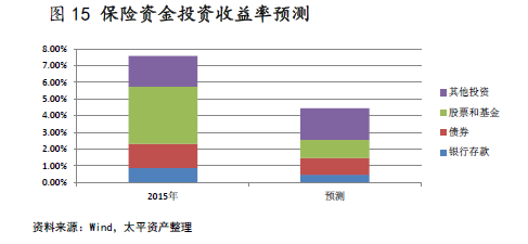 以目前保险行业平均资产配置比例测算,考虑未来各投资大类的收益率不断走低,以及2014年7月至2015年6月股票市场趋势性机会的不可复制和持续性,预计保险行业的年化投资收益率将由2015年的7.56%降低至4.4%左右,进一步压缩保险公司利差益。由于股票权益类投资波动较大,如股市持续萎靡甚至下行,则投资收益将更低,假设股票投资收益为零,则其他类型资产投资合计收益率预计3.36%(见图15)。